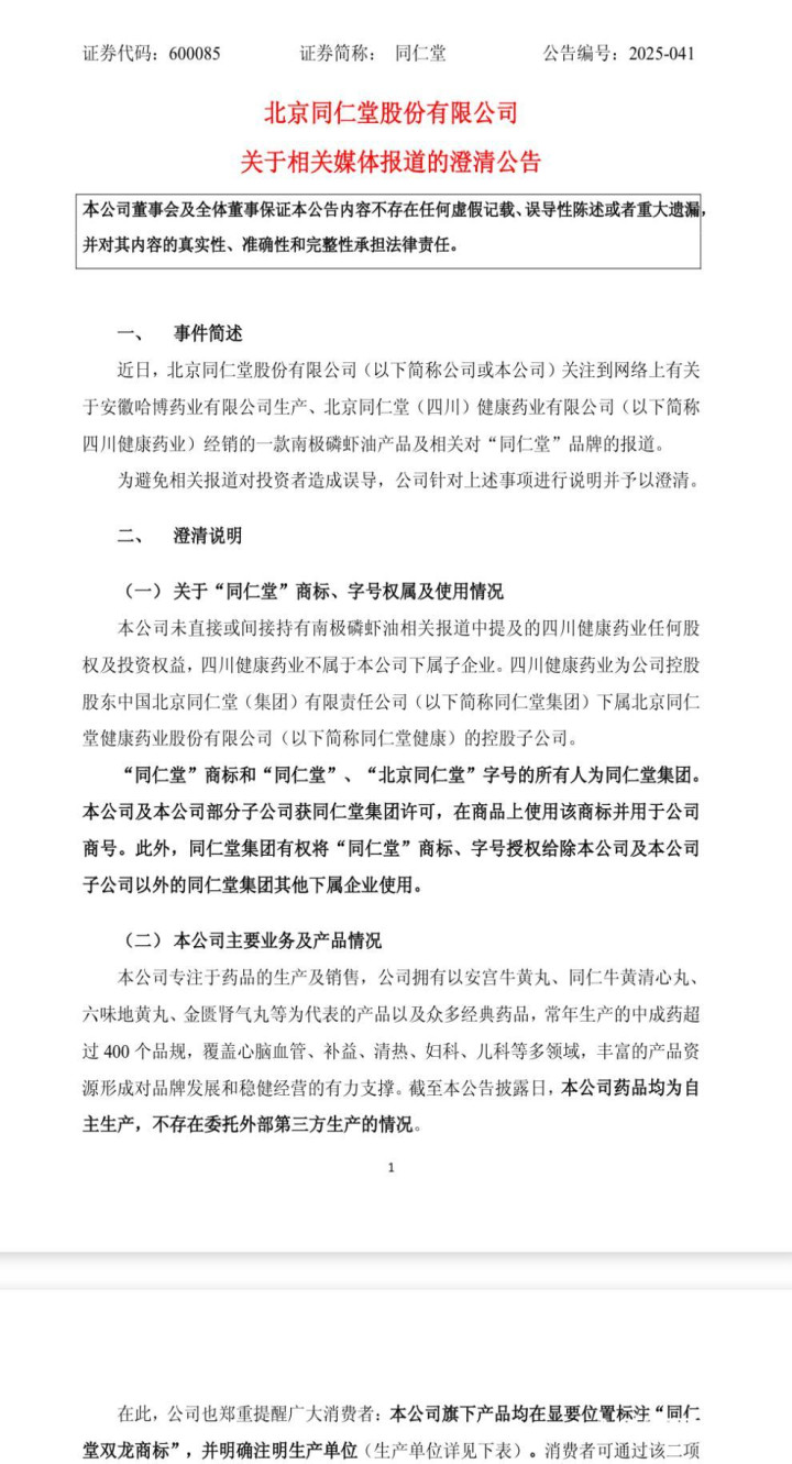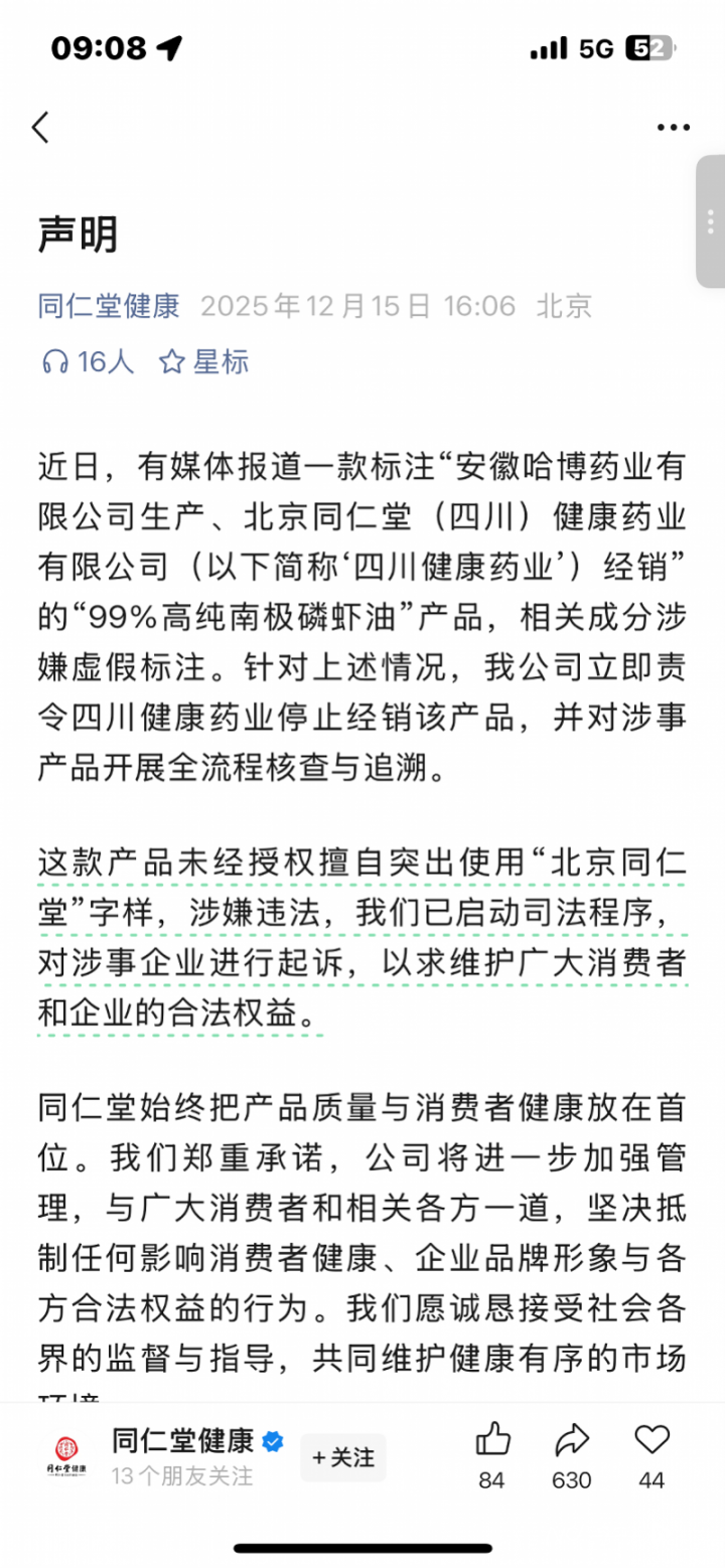 记者注意到,在此澄清公告之前,12月15日,北京同仁堂健康药业股份有限公司官方服务号发布声明,近日,有媒体报道一款标注“安徽哈博药业有限公司生产、北京同仁堂(四川)健康药业有限公司(以下简称‘四川健康药业’)经销”的“99%高纯南极磷虾油”产品,相关成分涉嫌虚假标注。“针对上述情况,我公司立即责令四川健康药业停止经销该产品,并对涉事产品开展全流程核查与追溯。”