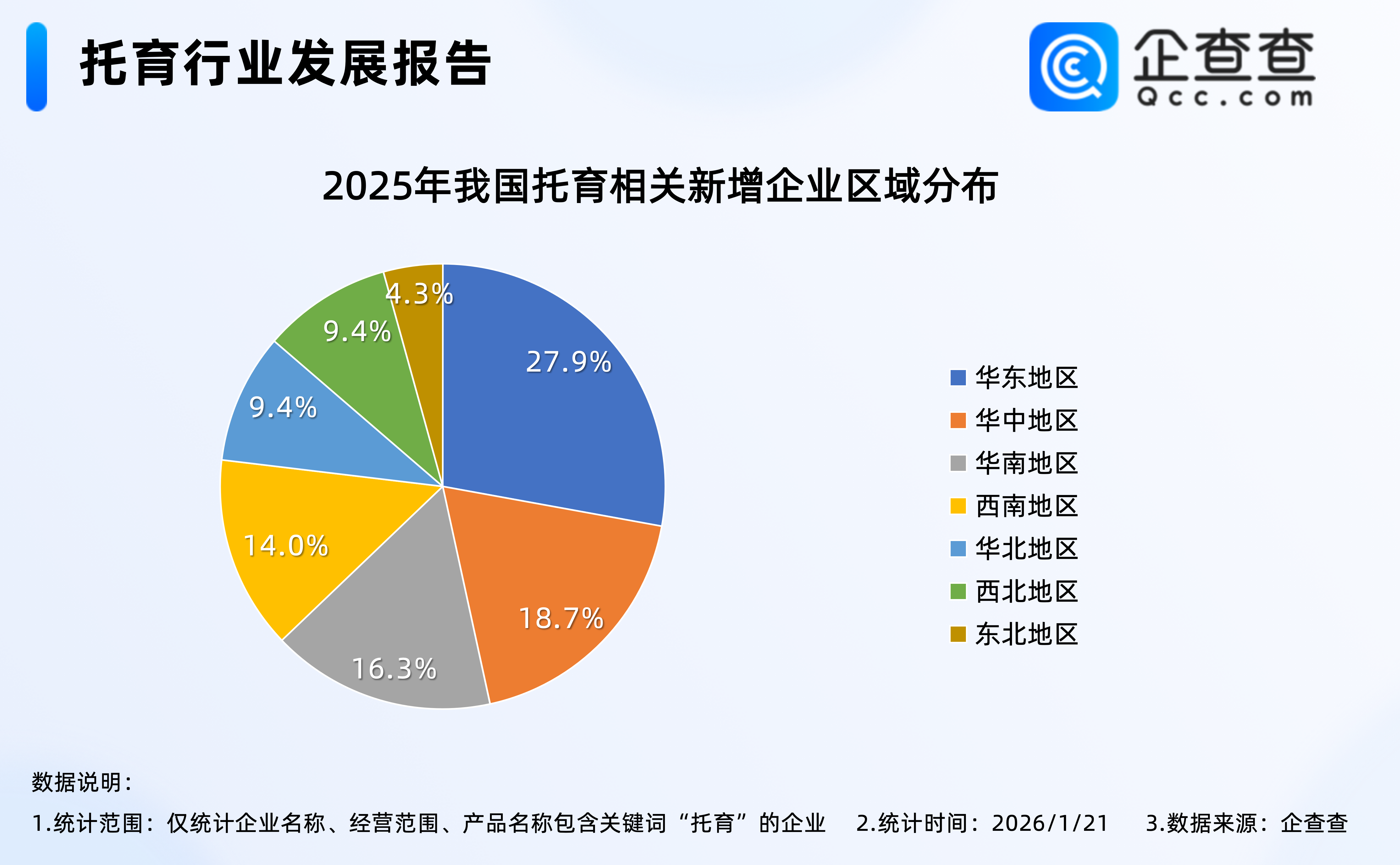 1月20日,财政部、税务总局、国家发展改革委、民政部、商务部和国家卫生健康委公告,为继续支持养老、托育、家政等社区家庭服务业发展,(一)提供社区养老、托育、家政服务取得的收入,免征增值税。(二)提供社区养老、托育、家政服务取得的收入,在计算应纳税所得额时,减按90%计入收入总额。(三)承受房屋、土地用于提供社区养老、托育、家政服务的,免征契税。(四)用于提供社区养老、托育、家政服务的房产、土地,免征不动产登记费、耕地开垦费、土地复垦费、土地闲置费等。企查查数据显示,截至1月21日,我国现存14.2万家托育相关企业,区域分布上,华东地区最多,占比33.6%,其次是华南、华中地区,分别占比14.6%、14.5%;2025年全年托育相关企业注册量达1.98万家,与全国存量区域分布不同的是,华中地区2025年累计注册3703家托育相关企业,占全国注册总量的18.7%,超过华南地区,华南地区占比16.3%。1.从企业存量来看:我国现存14.2万家托育相关企业