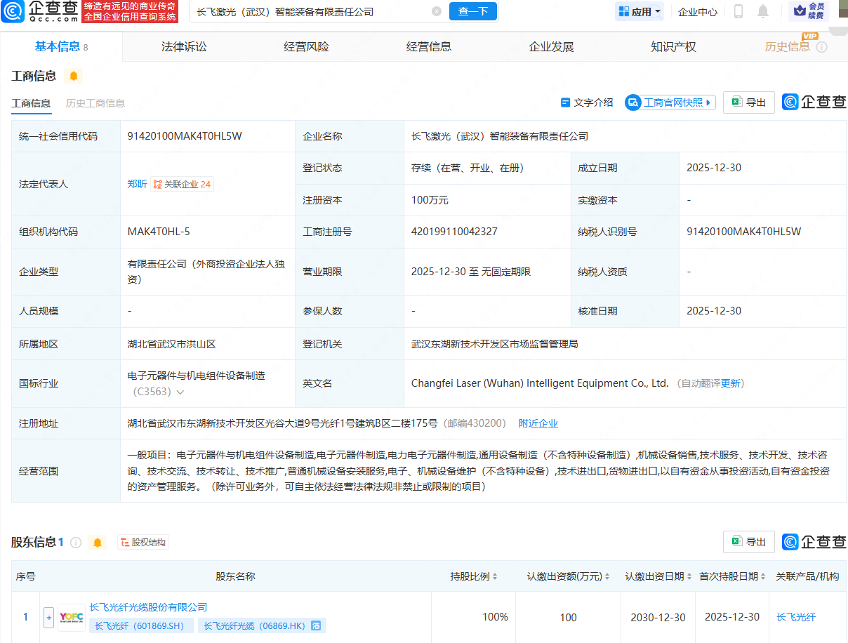 近日,长飞激光(武汉)智能装备有限责任公司成立,法定代表人为郑昕,经营范围包含:电子元器件与机电组件设备制造;电子元器件制造;电力电子元器件制造;机械设备销售等。企查查股权穿透显示,该公司由长飞光纤(601869)全资持股。